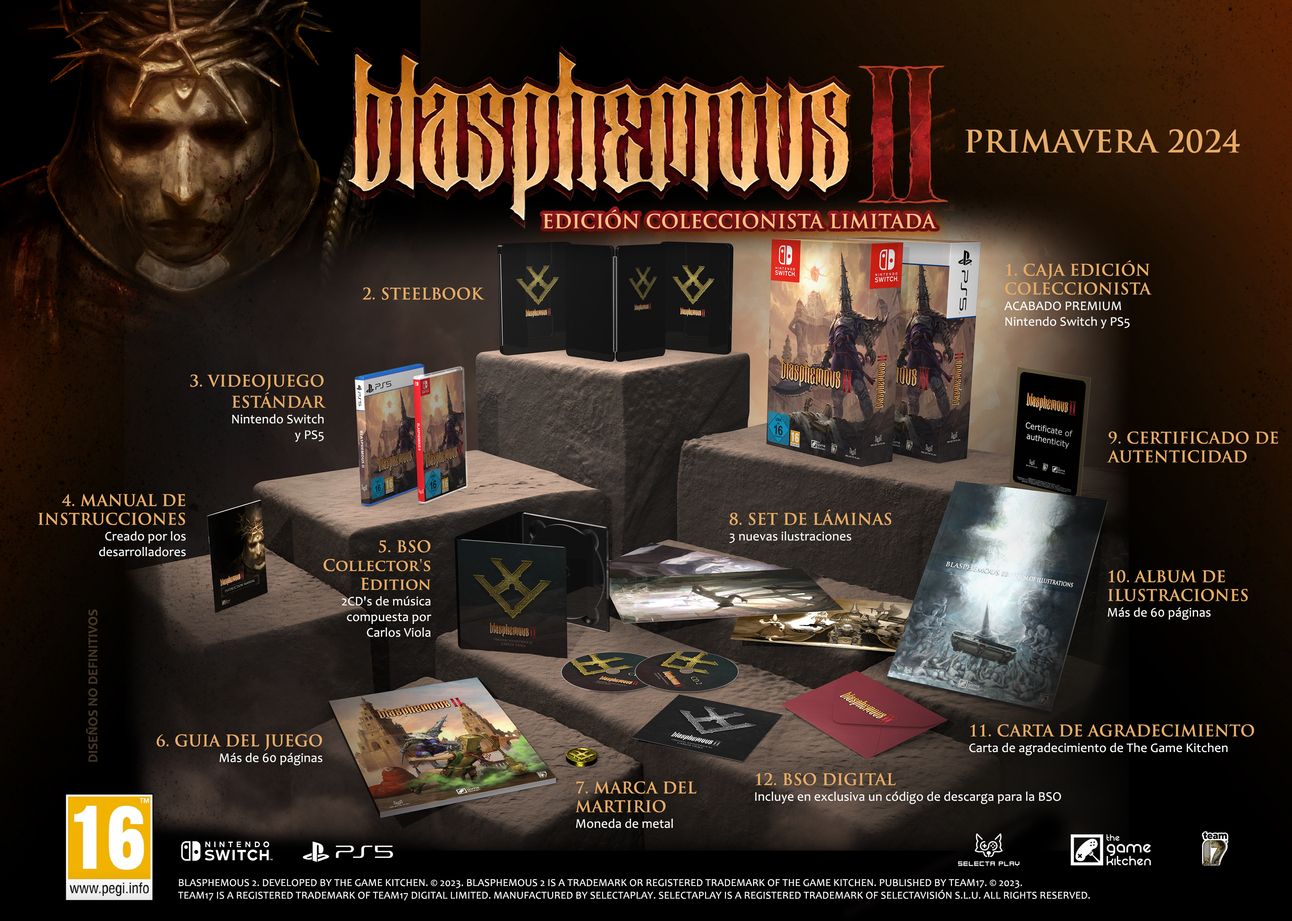 Blasphemous II: Aunque ya había salido otra edición física faltaba una coleccionista para uno de los mejores juegos indies del año. La edición viene bien completa y deberías cogerla si te interesa porque se ve que poco van a durar. Puedes reservarla aqui.