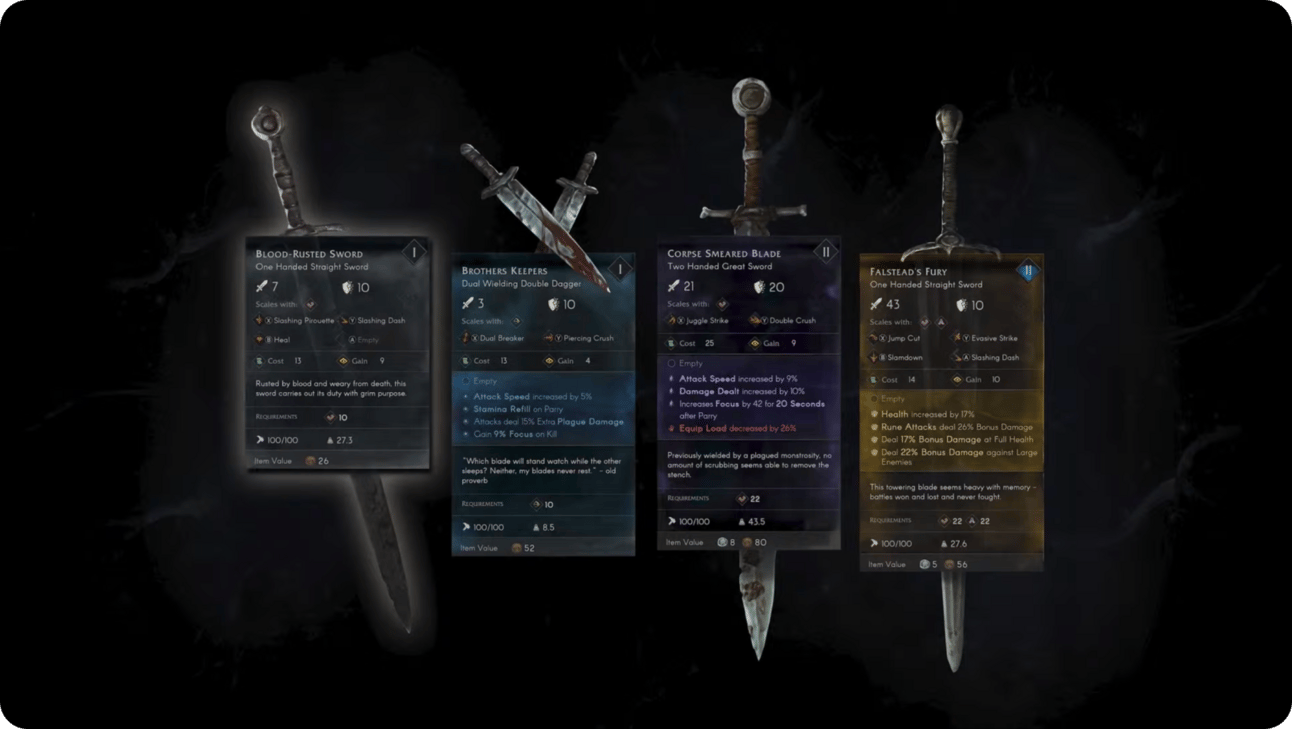 Cada arma es única, no hay dos iguales. Además de tener su propia postura exclusiva, cada arma puede tener accesorios y optimizarse en varias tiendas para que se ajuste a tus necesidades. ¡Infúndeles runas para añadirles efectos adicionales! En combate, las armas son una extensión de tu cuerpo: precisión, espacio, peso y movimiento colaborando en armonía.